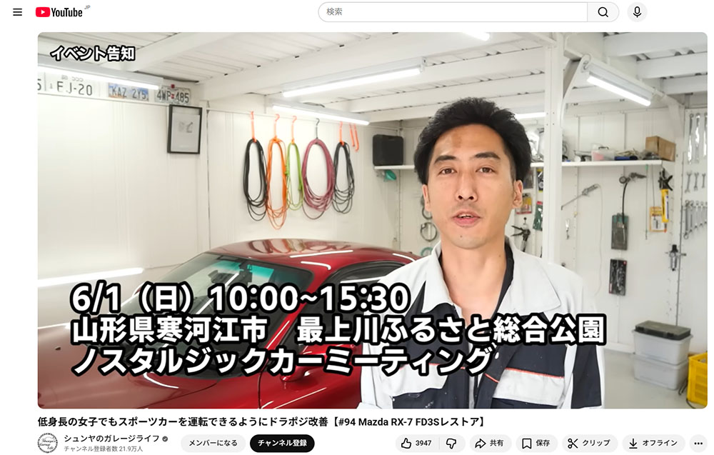 実際、チャンネルページ上でもレストア系の再生リストが前面に出ており、例えばRX-7(FD3S)やジムニー(JA22)など、時間をかけて“公道復帰”を目指す企画が打ち出されています。